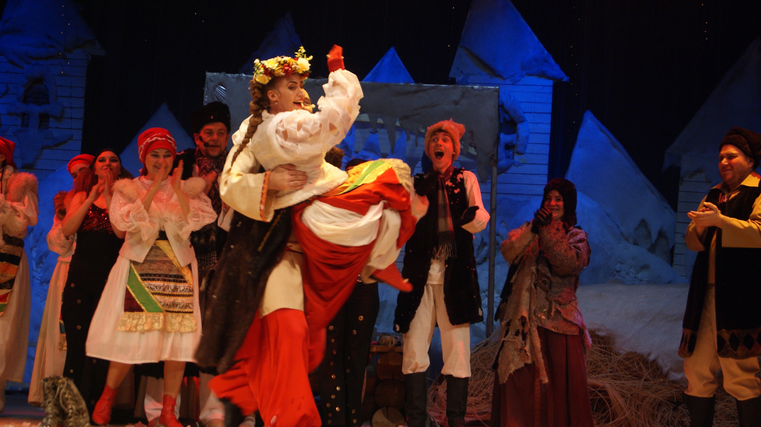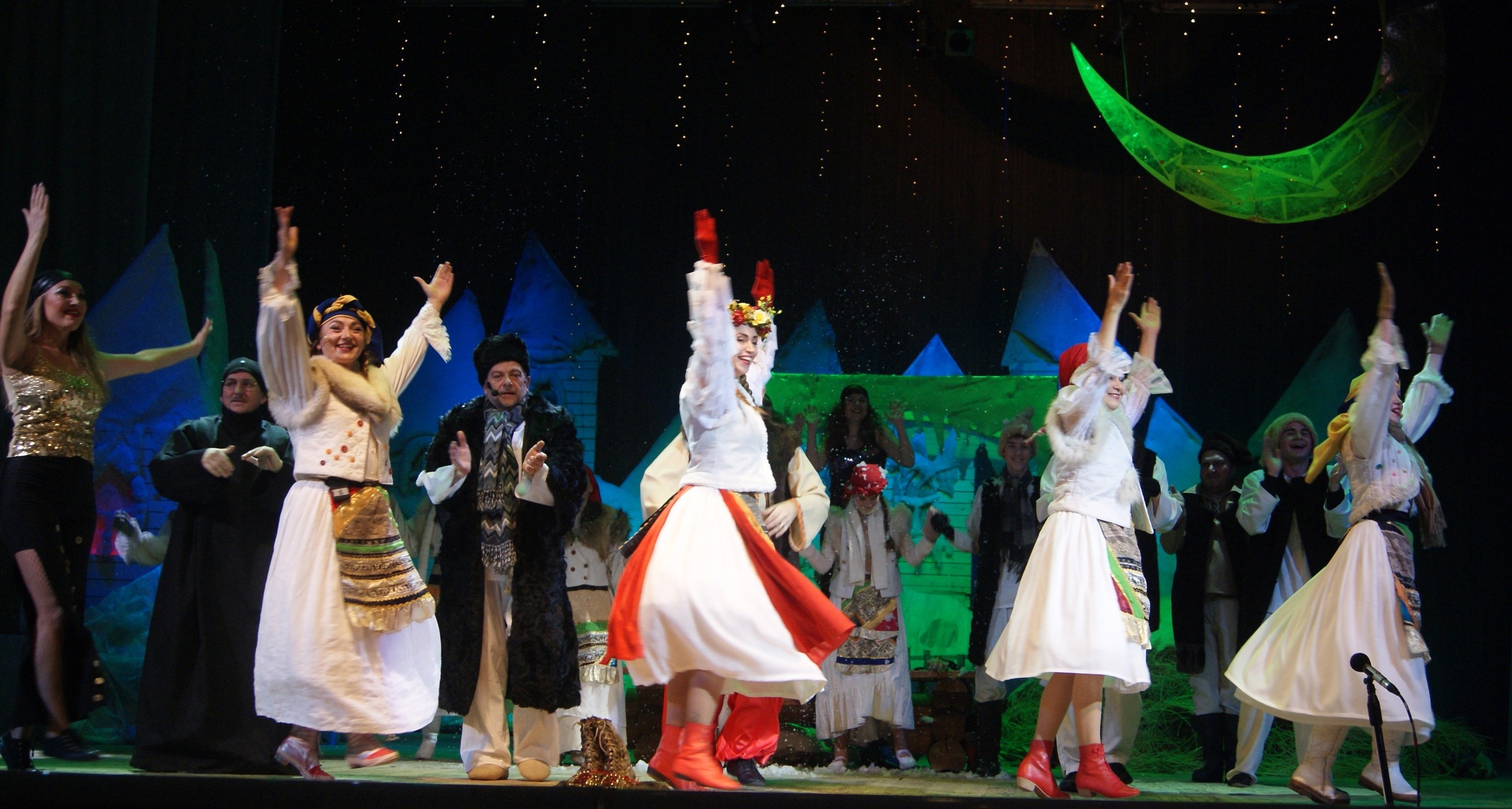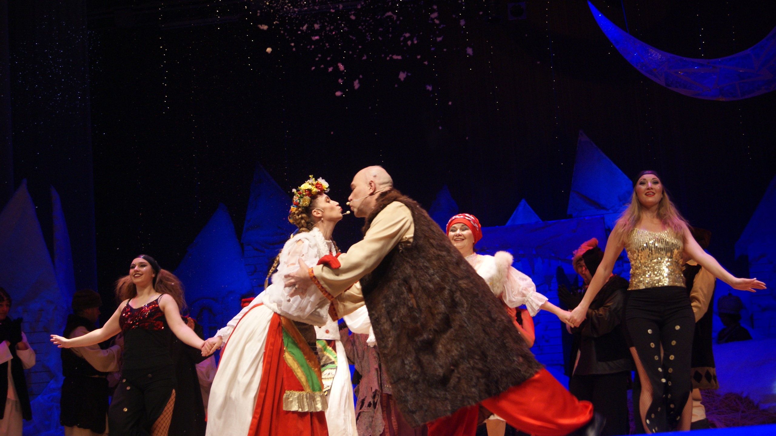 Так в нашем ДК прошел спектакль "Вечера на хуторе близ Диканьки" нашего любимого автора Николая Гоголя! В этом спектакле есть все, что мило русской душе: запах снега и морозца, песни и пляски ... и красивая сказка о любви...Гоголевская повесть получилась очень сказочной и захватывающей своими колядками, фантастическими галушками, реалистичными декорациями, музыкой и светом. Песни, пляски, встреча с ведьмами, угощение у самой Солохи, путешествие в Петербург верхом на Черте за царицыными черевичками для любимой - всё это запомнилось ребятам надолго! Зрители наслаждались счастливой сказкой о любви, поставленной режиссёром Татьяной Тимониной по мотивам повести "Ночь перед Рождеством", где царит талантливое выступление и неповторимое мастерство.